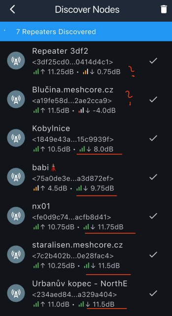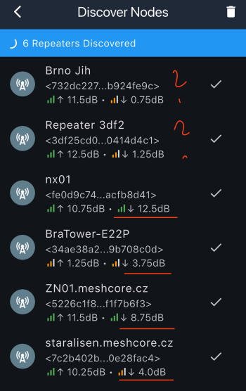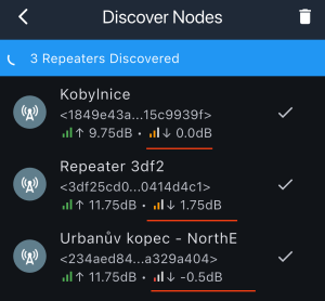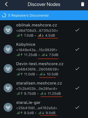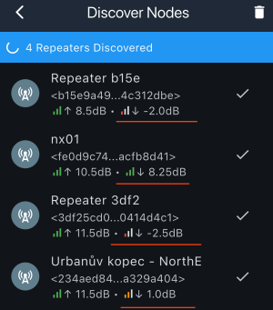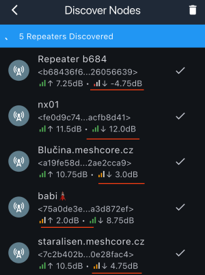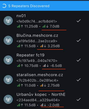 - U nalezenych repeaterů je vidět, že příjem signálu od ostatních repeaterů je velmi slabý, jelikož signál je rušený různými vysílači za zády.